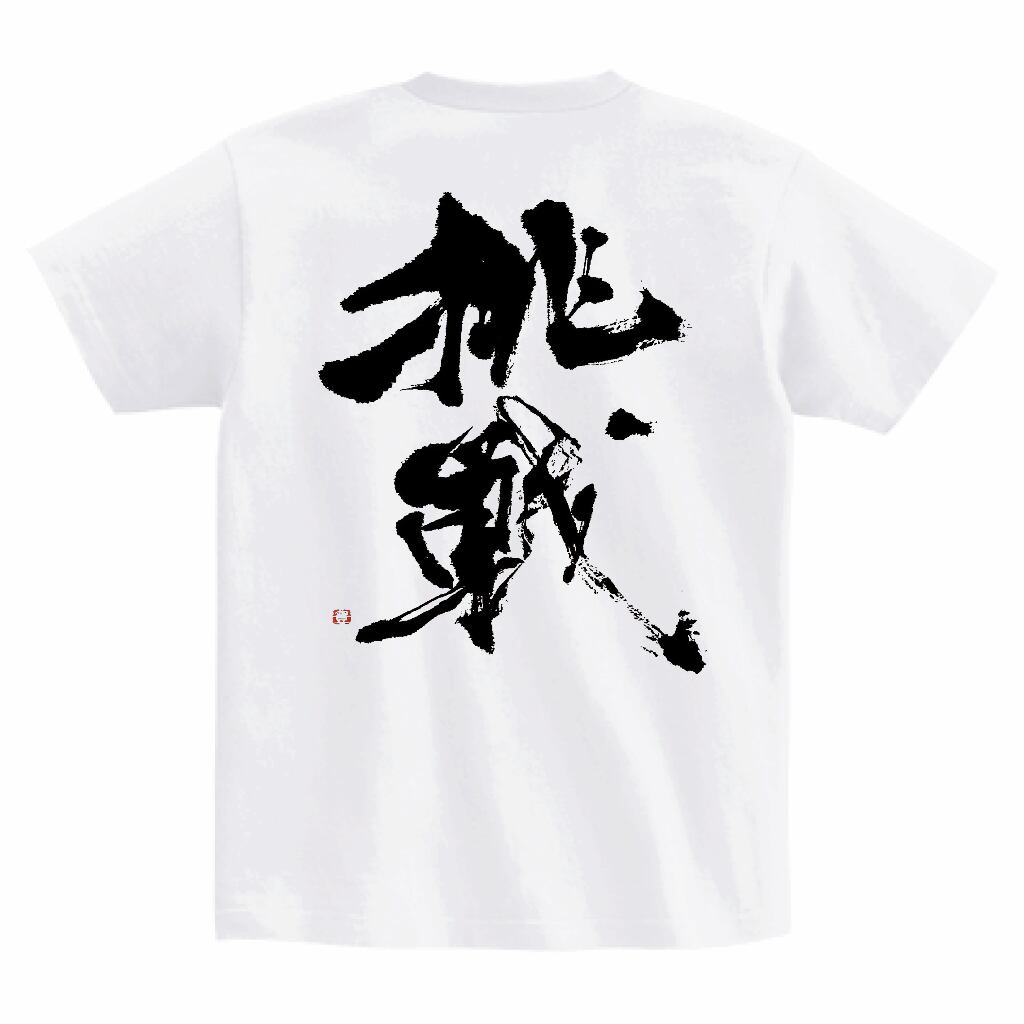 筆文字Tシャツ「挑戦」 前後プリント (ホワイト) Brush Calligraphy T-Shirt – “challenge” Front and back print | yoshinobland